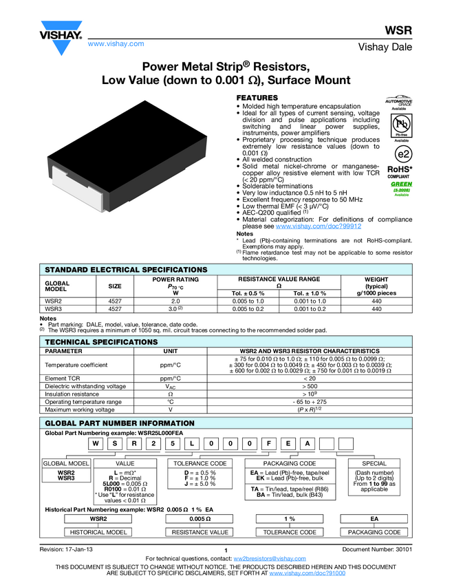 WSR2R0100FEA Rezystor; 10mOhm; 2W; thin film (Nichrome); 1%; 4527; SMD; 4527; 0R01, 0,01...