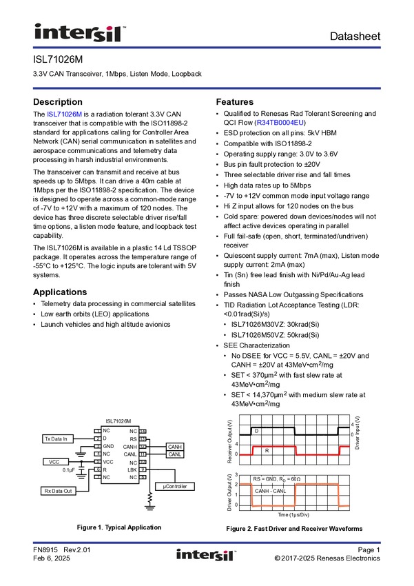 ISL71026M50VZ-T7A 3.3V CAN Transceiver, 1Mbps, Listen Mode, Loopback