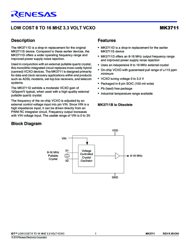 MK3711DMLF Low Cost 8 to 16 MHz 3.3 Volt VCXO