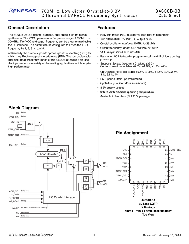 84330BY-03LFT 700MHz,Low Jitter,Crystal-to-3.3V Differential LVPECL Frequency Synthesizer