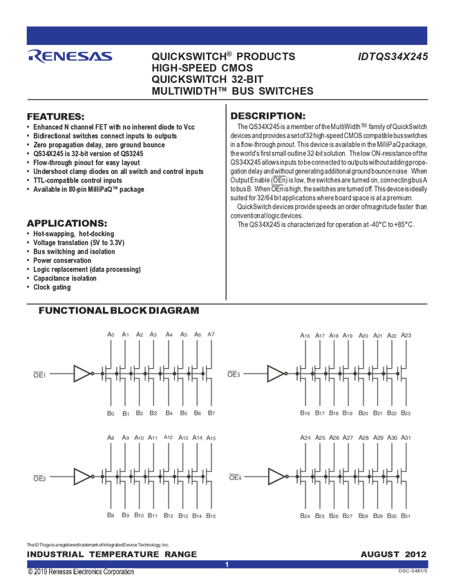 QS34X245Q3G High-Speed CMOS QuickSwitch 32-Bit Multi-Width Bus Switch