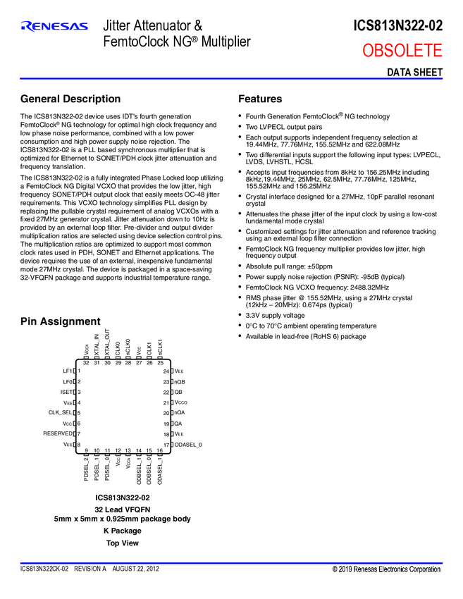 813N322CK-02LF Jitter Attenuator & FemtoClock NG Multiplier