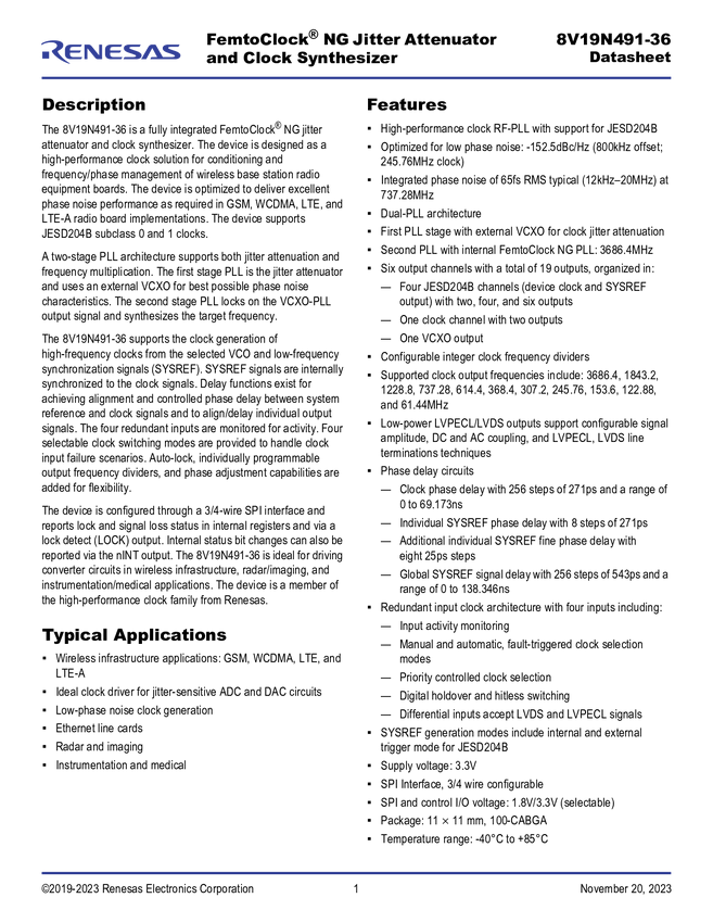 8V19N491-36BDGI JESD204B/C Clock Jitter Attenuator