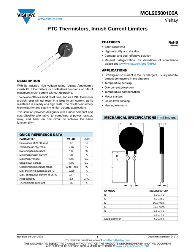 MCL20500100A PTC Thermistors, Inrush Current Limiters