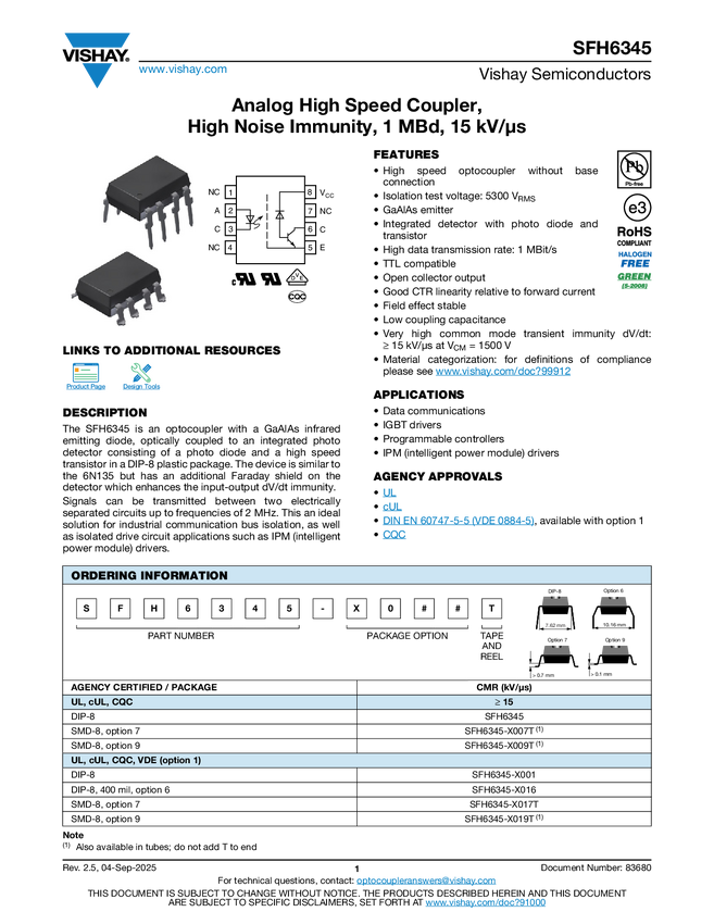 SFH6345 Analog High Speed Coupler, High Noise Immunity, 1 MBd, 15 kV/µs