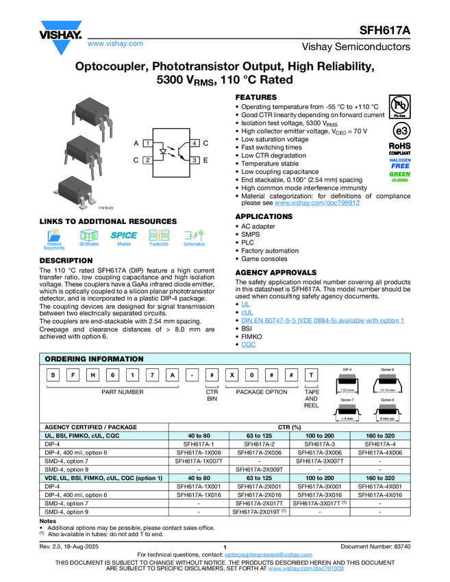 SFH617A Optocoupler, Phototransistor Output, High Reliability, 5300 VRMS, 110 &#176...