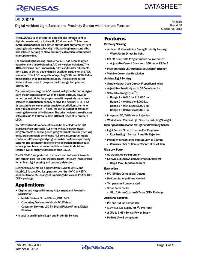 ISL29018IROZ-T7 Digital Ambient Light Sensor and Proximity Sensor with Interrupt Function