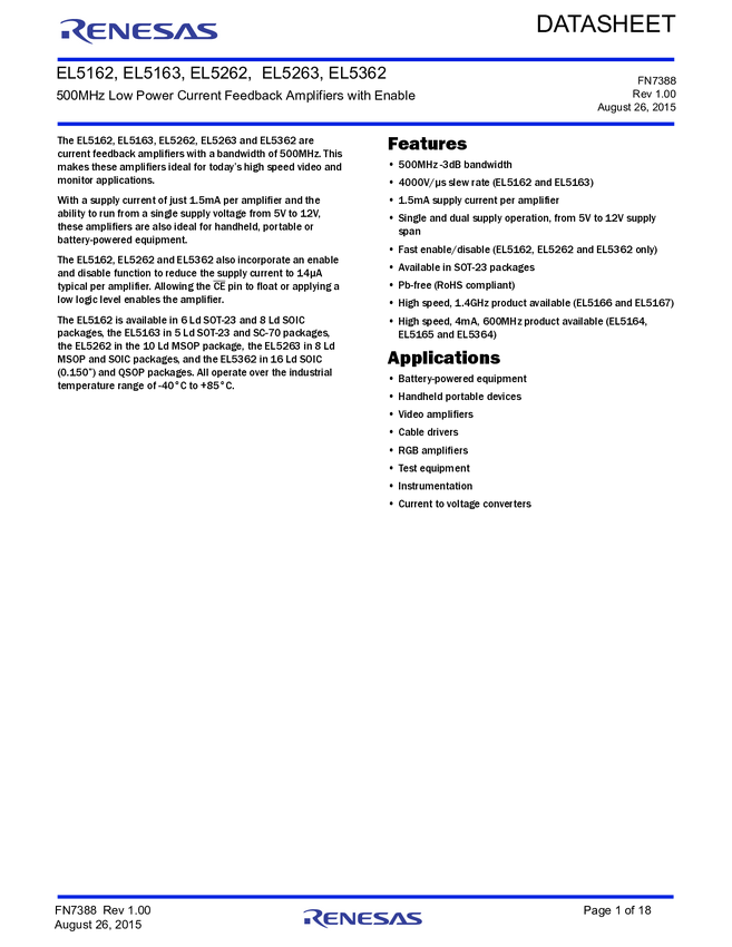 EL5362ISZ 500MHz Low Power Current Feedback Amplifiers with Enable