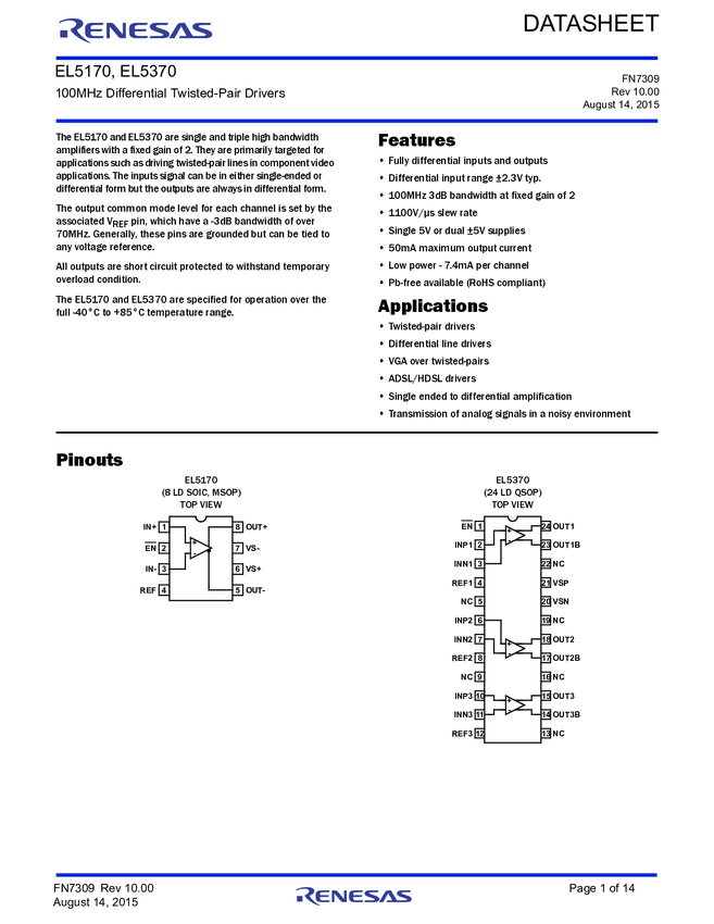 EL5370IU 100MHz Differential Twisted-Pair Drivers