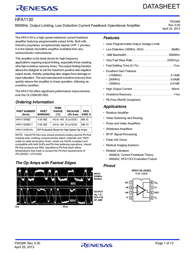 HFA1130IBZ 850MHz, Output Limiting, Low Distortion Current Feedback Operational Amplif...