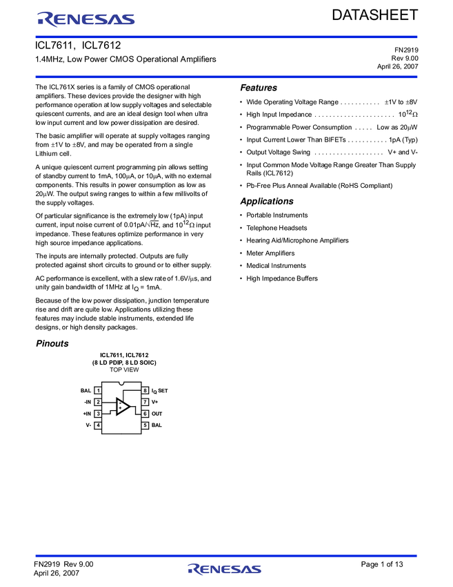ICL7611DCBAZ 1.4MHz, Low Power CMOS Operational Amplifiers