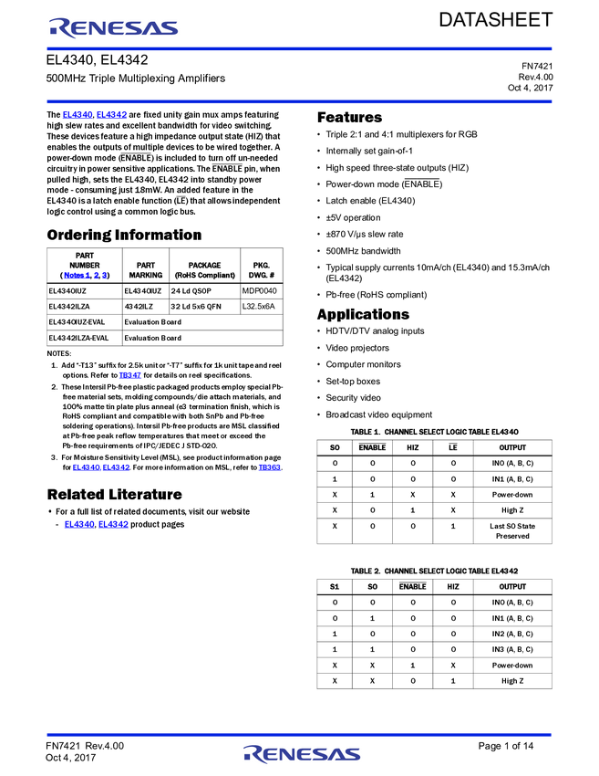 EL4342ILZA 500MHz Triple, Multiplexing Amplifier