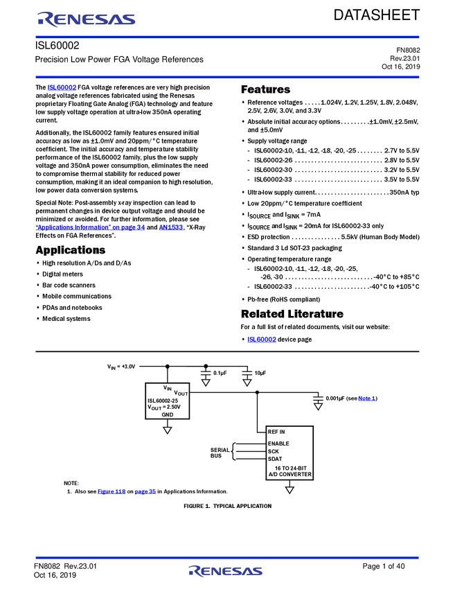 ISL60002BIH311Z-TK Precision Low Power FGA™ Voltage References