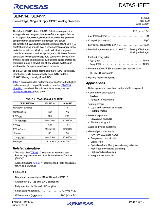 ISL84515IBZ Low-Voltage, Single Supply, SPST, Analog Switches