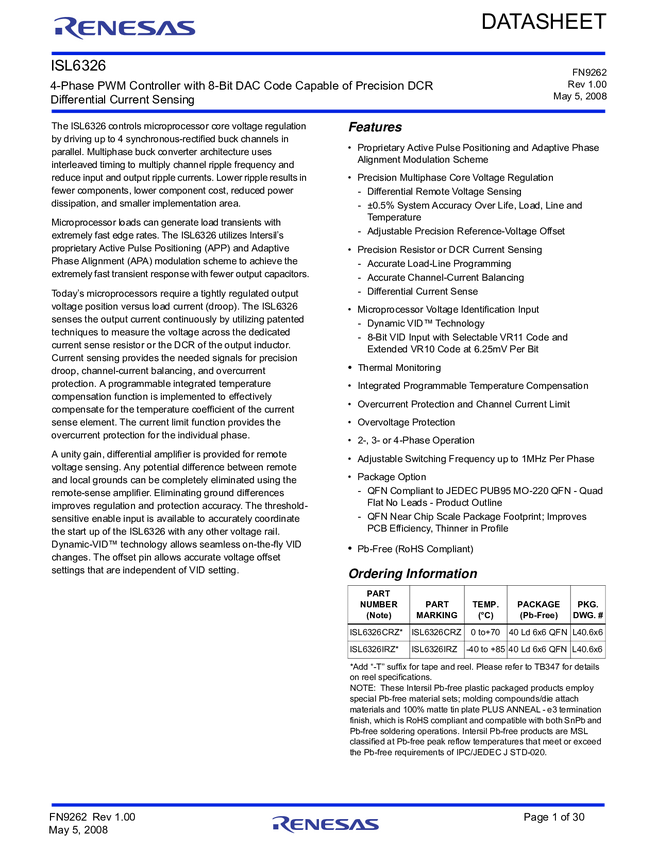 ISL6326CRZ-T, ISL6326IRZ, ISL6326IRZ-T, ISL6326