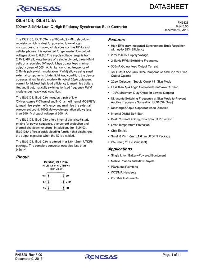 ISL9103AIRUCZ-T 500mA 2.4MHz Low IQ High Efficiency Synchronous Buck Converter