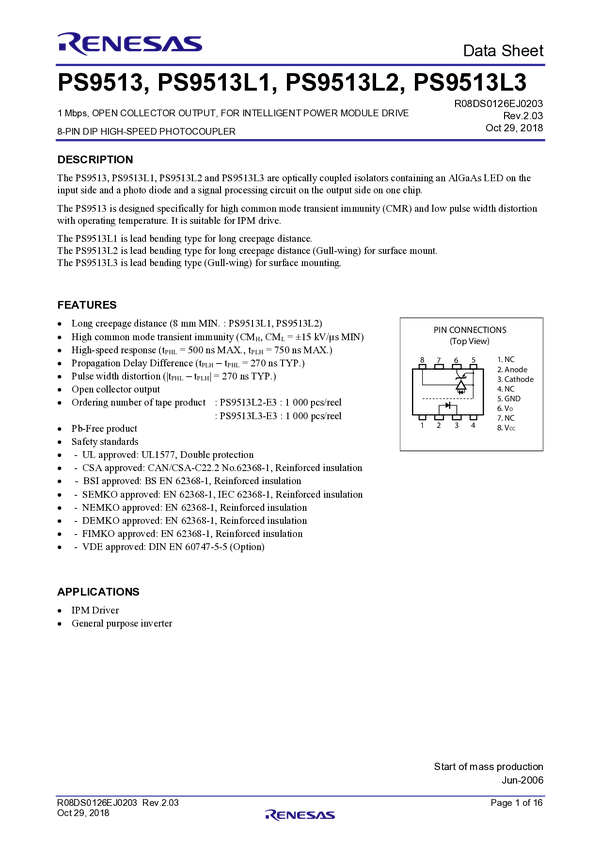 PS9513L3-AX 1 Mbps, Open Collector Output, for Intelligent Power Module Drive 8-pin DIP...