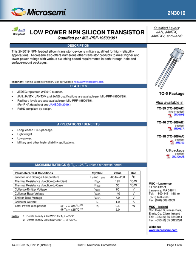 2N3019-Transistor, JANTXV2N3019-Transistor, JAN2N3019-Transistor, 2N3019E3-Transistor-RoHS, JANTX2N3019-Transistor, JANS2N3019-Transistor, 2N3019A-Transistor