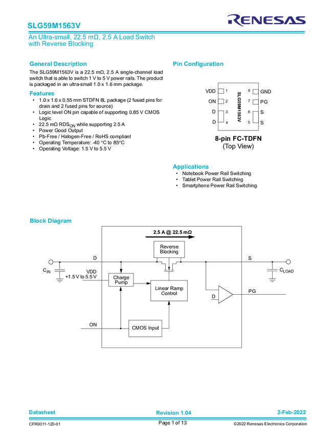 SLG59M1563V 5.5V, 22.5mΩ, 2.5A Load Switch with Power Good Output and Reverse Current B...