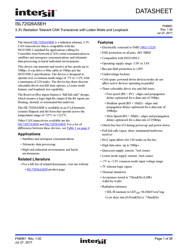 ISL72026ASEHF/PROTO 3.3V Radiation Tolerant CAN Transceiver with Listen Mode and Loopback