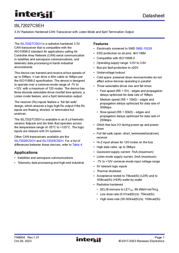 ISL72027CSEHVF 3.3V Radiation Hardened CAN Transceiver with Listen Mode and Split Terminat...