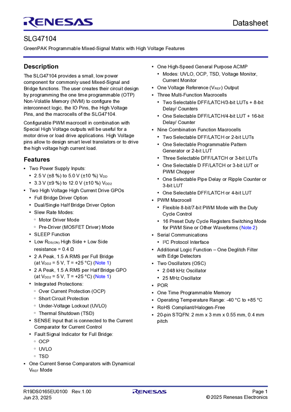 SLG47104 HVPAK Programmable Mixed-Signal IC, VDD Range: 2.3-5.5V, 10 GPIOs, 1 ACMP,...