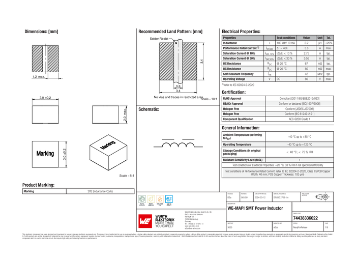 Cewka mocy; dławik; 2,2uH; 3,6A; 0,080ohm; 3x3x2mm; SMD; seria WE-MAPI; 20%; -40-125*C; Würth Elektronik; 744 383 360 22; RoHS; op/100szt