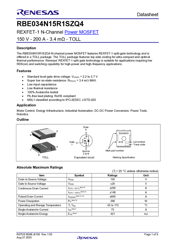 RBE034N15R1SZQ4#GB0 150V, 200A, 3.4mΩ, REXFET-1 N-Channel Power MOSFET in TOLL