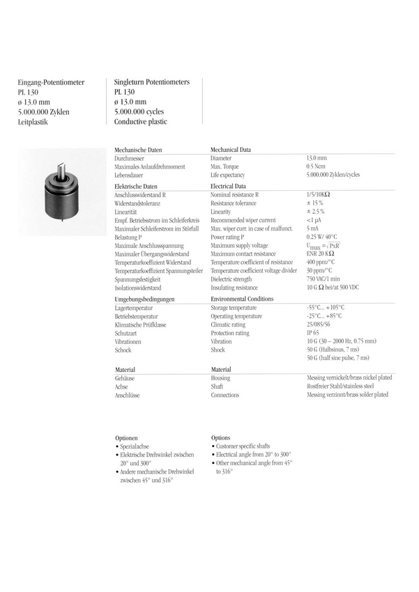 Potencjometr przew.plastyk; Bushing; lin 2.5%; tol 15%; IP65 1 obrotowy; średnica 13mm; ośka 3mm trwałość 5.000.000 obr; moc 0,25W
