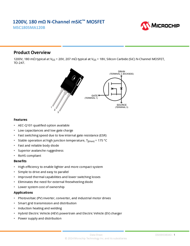 MSC180SMA120B 1200V, 180 mOhm mSiC™ MOSFET TO-247 Datasheet