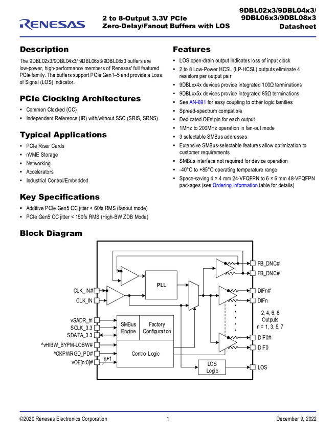9DBL0643ANDGI 6-Output 3.3V PCIe Zero-Delay/Fanout Clock Buffer with Loss of Signal Indic...