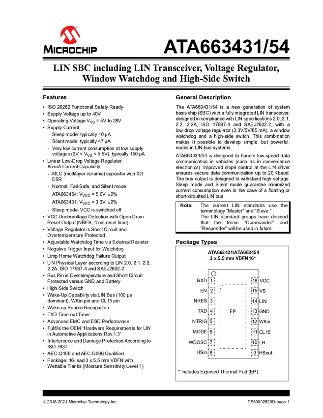 ATA663431 ATA663431/54 - LIN SBC - LIN Transceiver, Volt Reg, Watchdog, HS Switch
