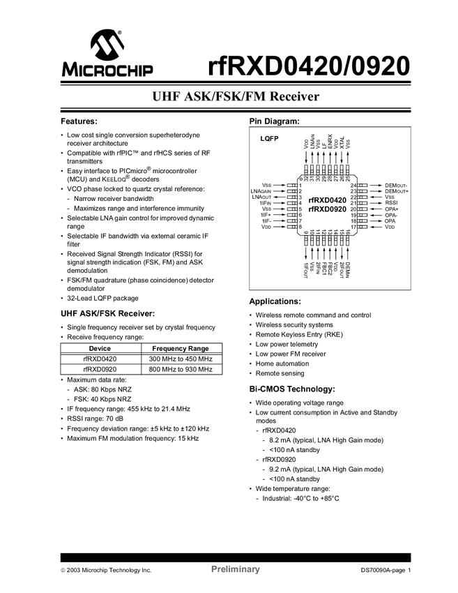 rfRXD0920 rfRXD0420/0920 UHF ASK/FSK/FM Receiver