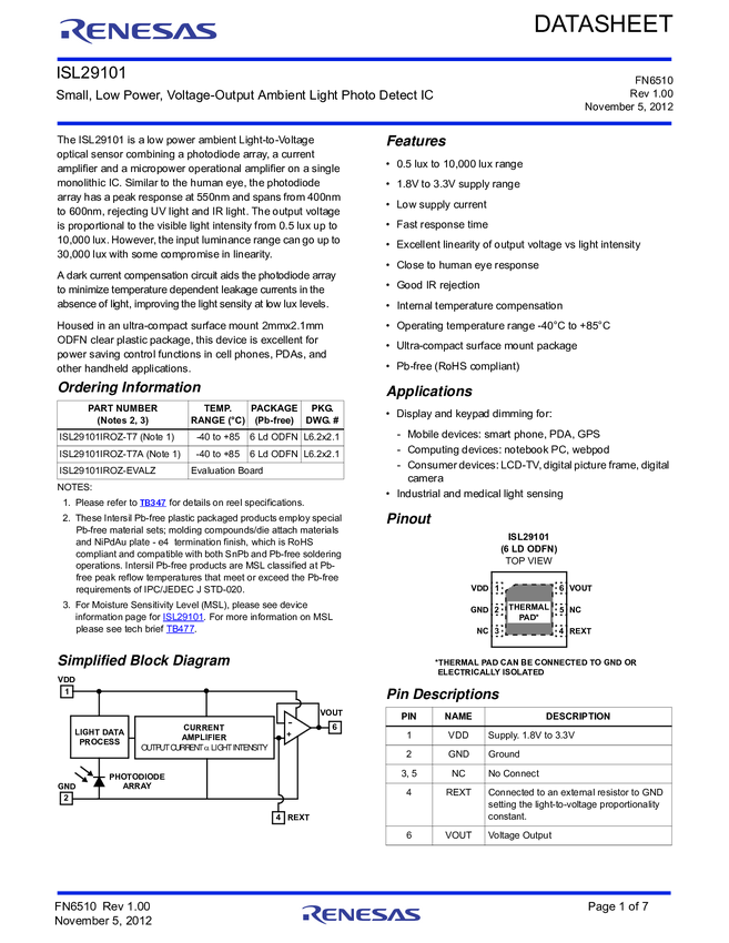 ISL29101IROZ-T7 Small, Low Power, Voltage-Output Ambient Light Photo Detect IC