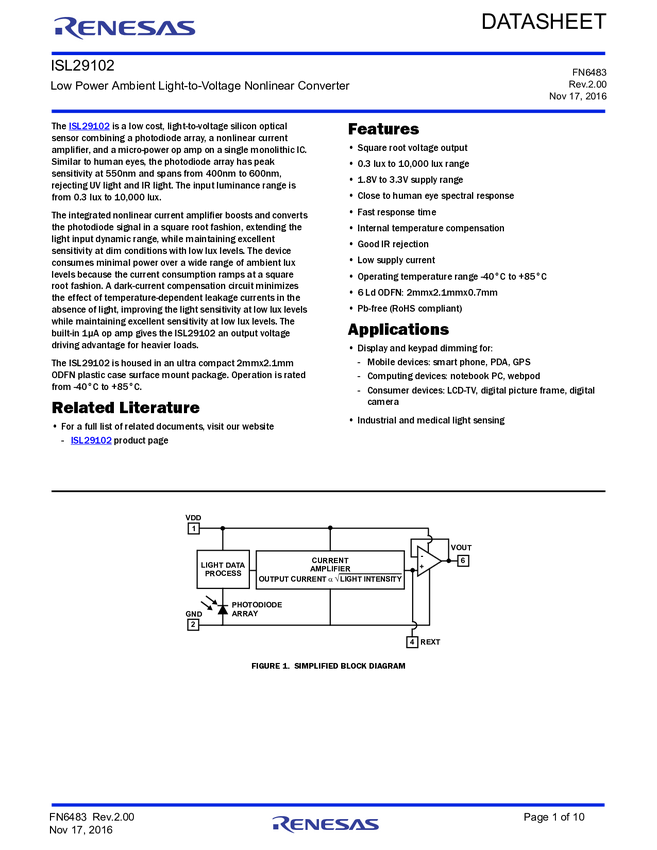 ISL29102IROZ-T7 Low Power Ambient Light-to-Voltage Non-Linear Converter