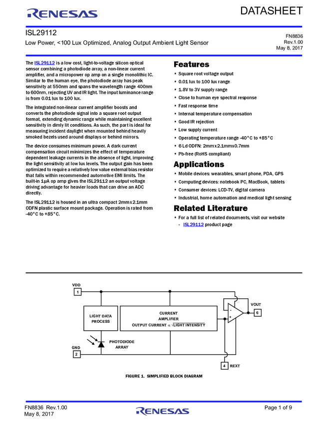 ISL29112IROZ-T7 Low Power, <100 Lux Optimized, Analog Output Ambient Light Sensor
