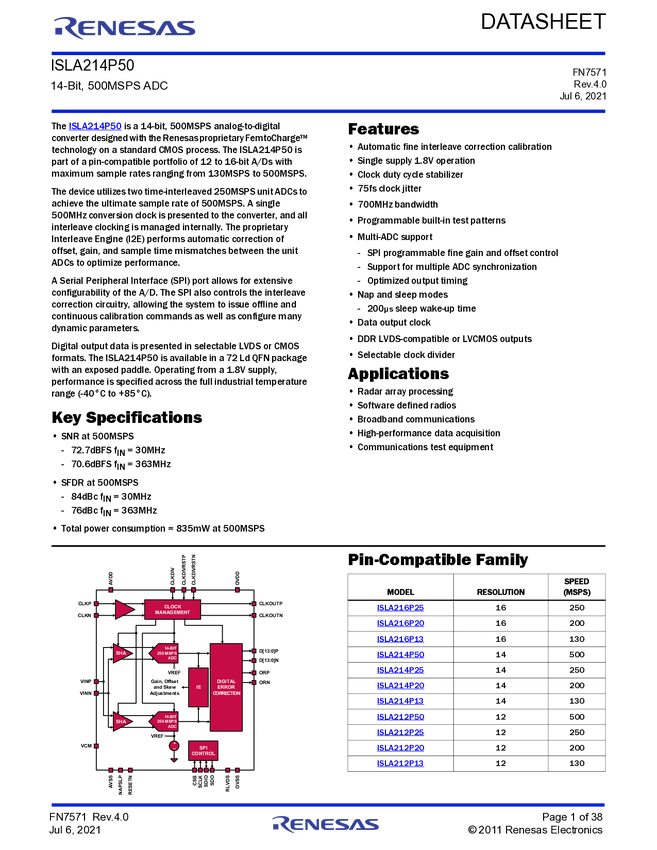 ISLA214P50IRZ 14-Bit, 500MSPS ADC