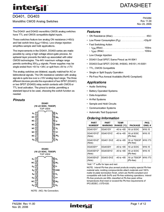 DG401DVZ Monolithic CMOS Analog Switches