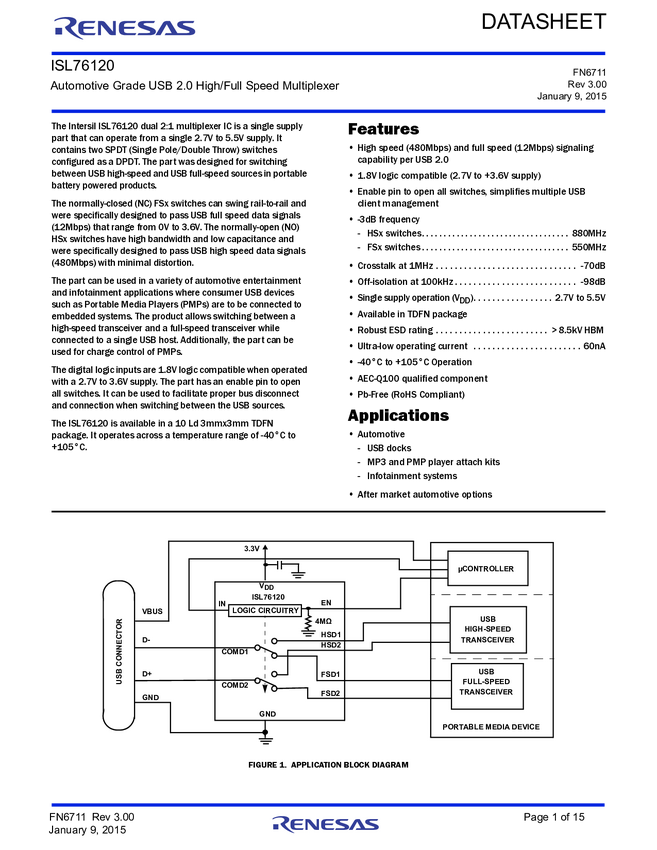 ISL76120ARTZ Automotive Grade USB 2.0 High/Full Speed Multiplexer