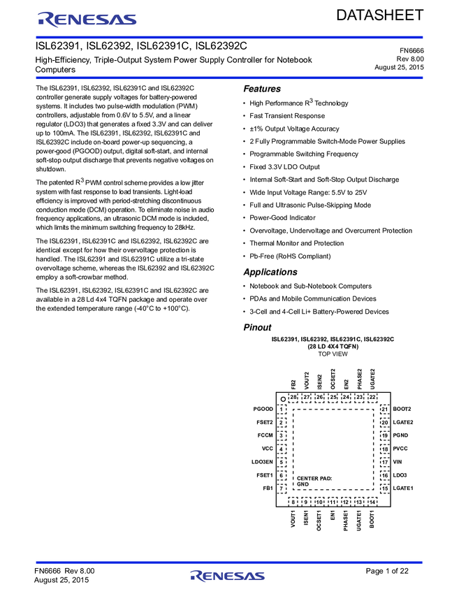 ISL62391CHRTZ High-Efficiency, Triple-Output System Power Supply Controller for Notebook...