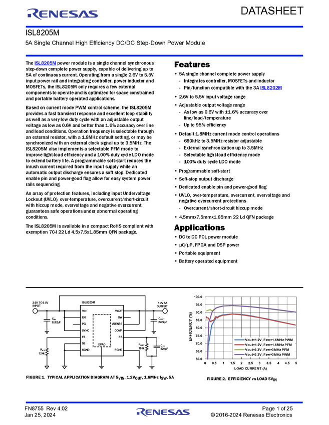 ISL8205MIRZ-T 5A Single Channel High Efficiency DC/DC Step-Down Power Module
