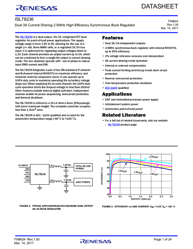 ISL78236ARZ Dual 3A Current Sharing 2.5MHz High Efficiency Synchronous Buck Regulator