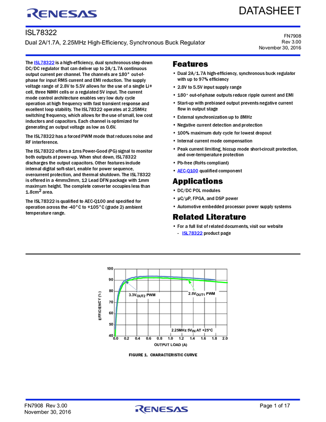 ISL78322ARZ Dual 2A/1.7A Low Quiescent Current 2.25MHz High Efficiency Synchronous Buck...