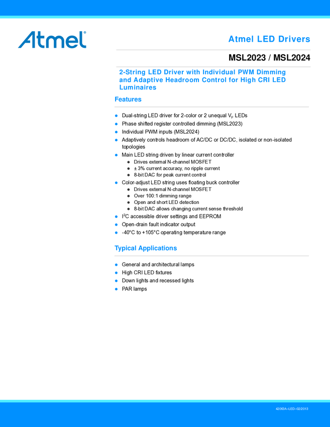 MSL2023/MSL2024 Datasheet - 2-String LED Driver with Individual PWM Dimming and Adaptive Headroom Control for High CRI LED Luminaires