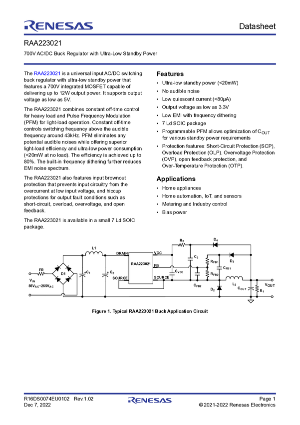 RAA2230214GSP#AA1 700V AC/DC Regulator with Ultra-Low Standby Power and up to 12W Output Powe...