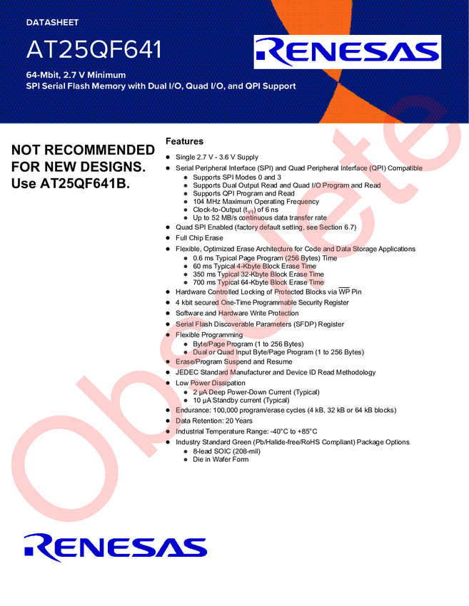 AT25QF641-DWF 64Mbit, 3V SPI Serial Flash Memory with Dual I/O and Quad I/O Support