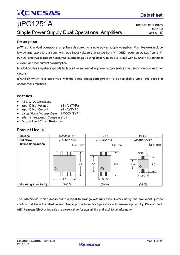 UPC1251AGR(20)-9LG-E1-A Automotive-Grade, Single-Power Supply, Bipolar Dual Operational Amplifiers