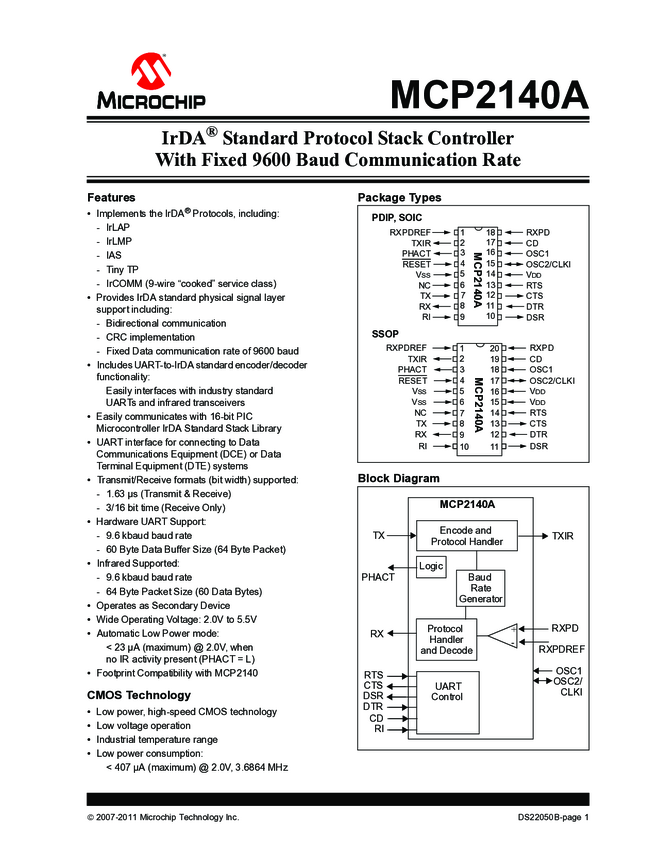 MCP2140A IrDA Standard Protocol Stack Controller With Fixed 9600 Baud Communication...