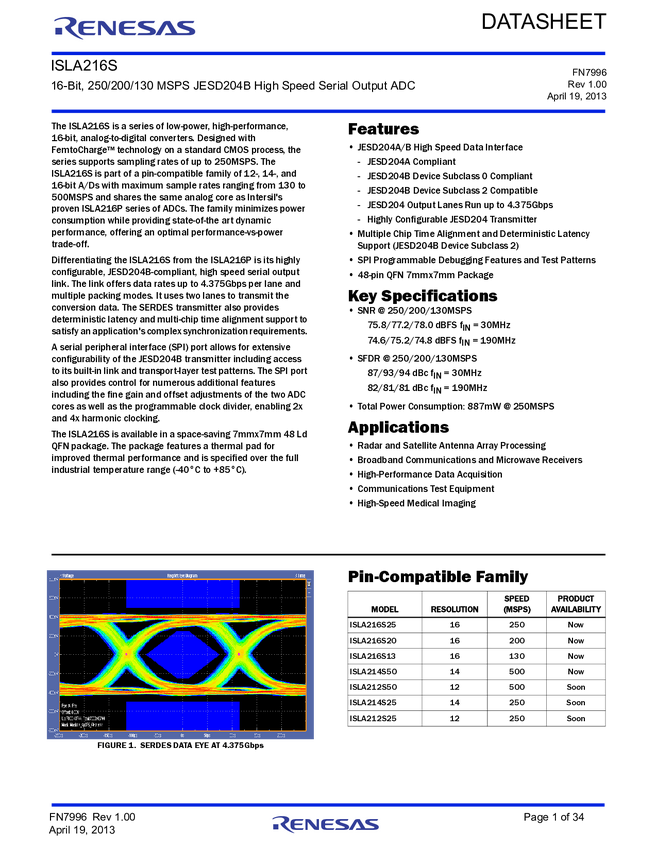 ISLA216S13 16-Bit, 130MSPS JESD204B High Speed Serial Output ADC