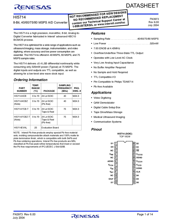 HI5714 8-Bit, 40/60/75/80 MSPS A/D Converter